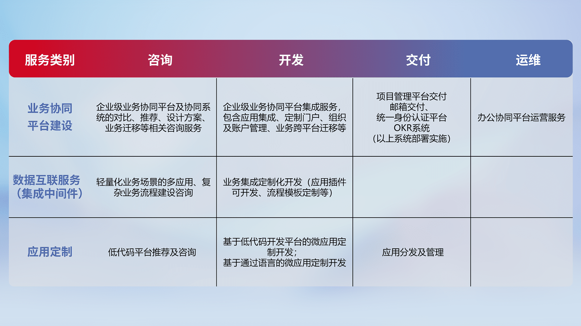针对钉钉、、企微、、IDaas等平台级产品提供产品的规划、、、方案、、、交付、、、、定制化开发等服务,,实现如统一协同办公、、智能客户服务、、混合会议管理、、、、智能数据查询、、、等业务场景,,,实现数字化转型。。。。
